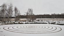 Eine Spirale auf dem vereisten Fläche eines Löschteiche…
