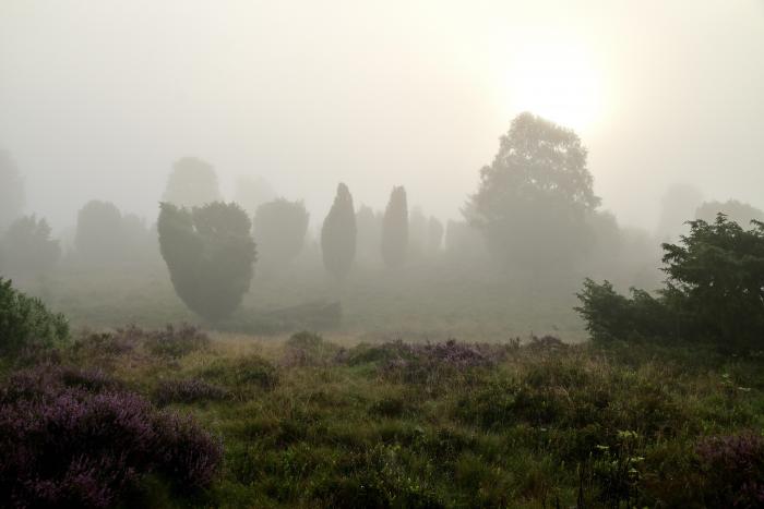 Im dichten Nebel starteten wir unsere Radtour durch die Heide. Gegen 7:30 Uhr kämpfte sich die Sonne durch den Nebel und tauchte die Landschaft in ein mystisches Licht.