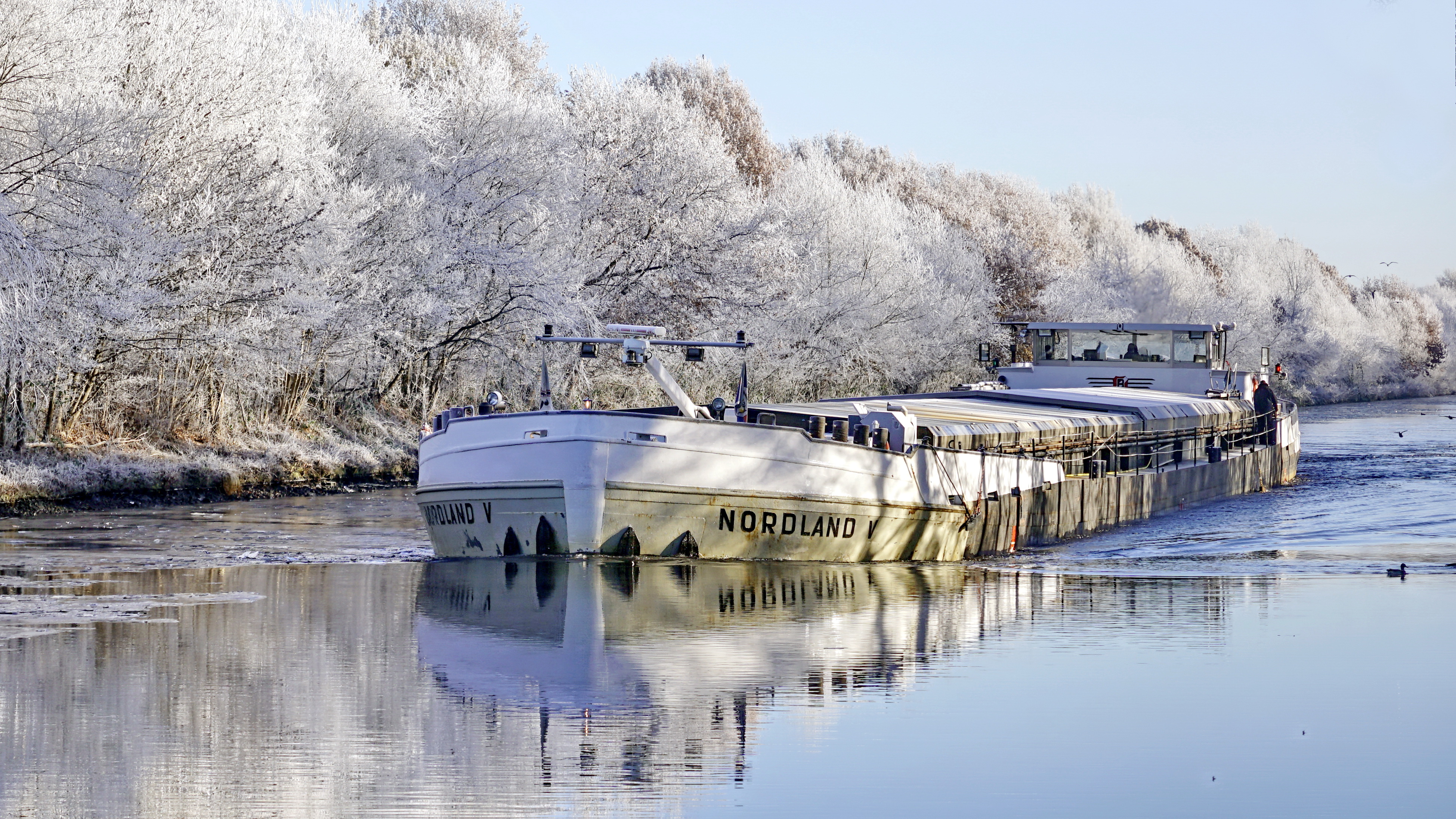 Ein Binnenschiff auf dem noch nicht gefrorenen Küstenkanal in der Gemeinde Edewecht