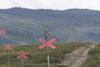 Auf einen Wanderweg in Abisko war eine Eule am Tag aktiv und beobachtete die Wanderer