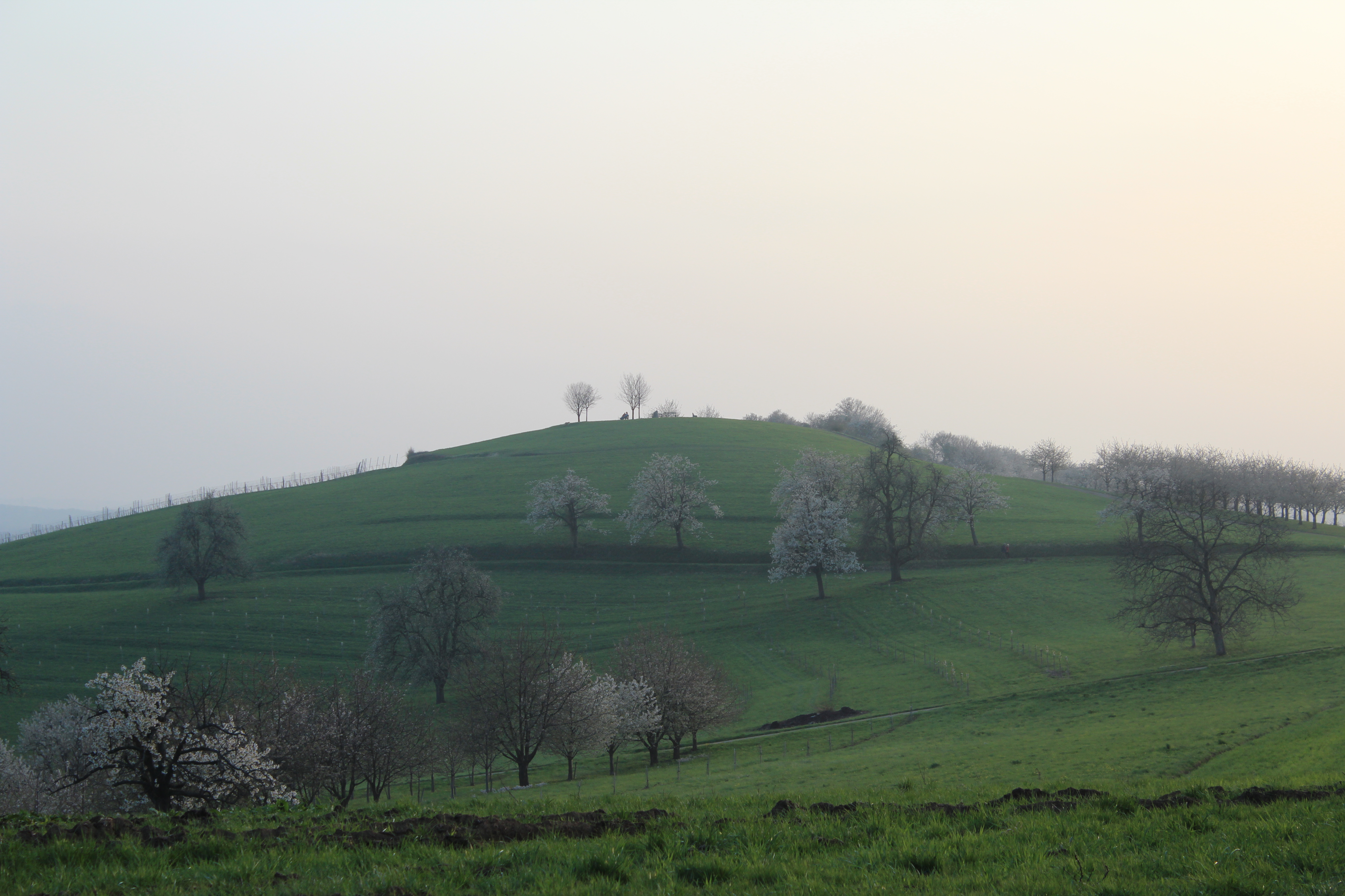 Osterspaziergang am Abend,- ich fand diese ruhige Stimmung mit den blühenden Kirschbäumen zum Träumen schön. Dort oben sitzen und ins Weite sehen ...